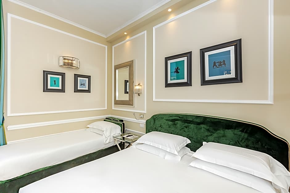 PRESTIGE DUOMO VIEW is 258 square feet and includes either a queen-size bed 150-154 width or 2 single beds 80-130 width plus a sofa bed plus desk, satellite tv , hairdryer, tea and coffee making facilities , safe, bathrobes, and slippers.