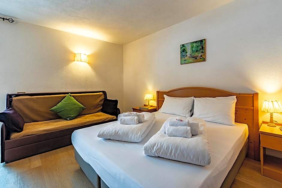 This family room is consisted of of a flat-screen TV with satellite channels, a private bathroom as well as a balcony with mountain views. The unit has 1 bed.