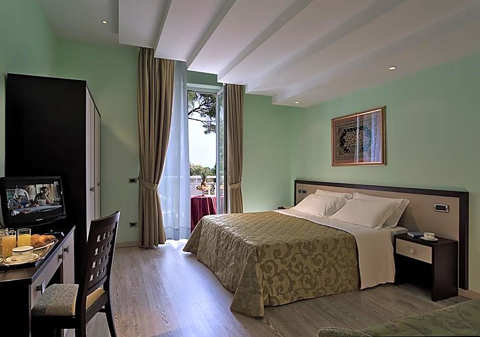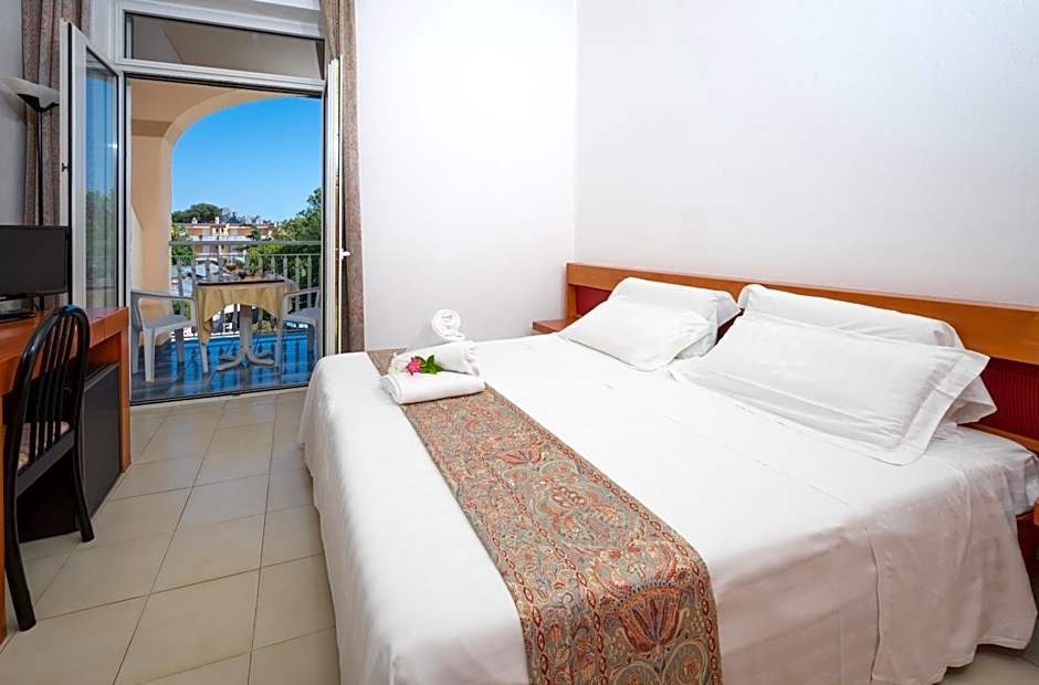 This room offers a double bed and a balcony or terrace overlooking the internal courtyard, the street, or the swimming pool.
