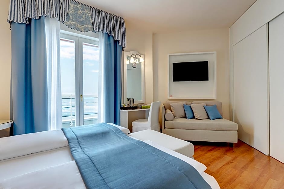 A broad range of room types ensures choices for couples, families, and groups. Sea-view doubles like Room With Sea View offer a generous setup (accommodates up to 4 adults and 3 children with a queen bed), while suites provide extra space and comfort, such as Suite, Balcony with a sofa bed and a queen, and Deluxe Suite, Sea View with a king bed plus sofa bed. For larger gatherings, options like Connecting Double Room (Family) feature multiple beds, and other configurations include Economy, Double and Suite varieties, some with partial or full sea views.