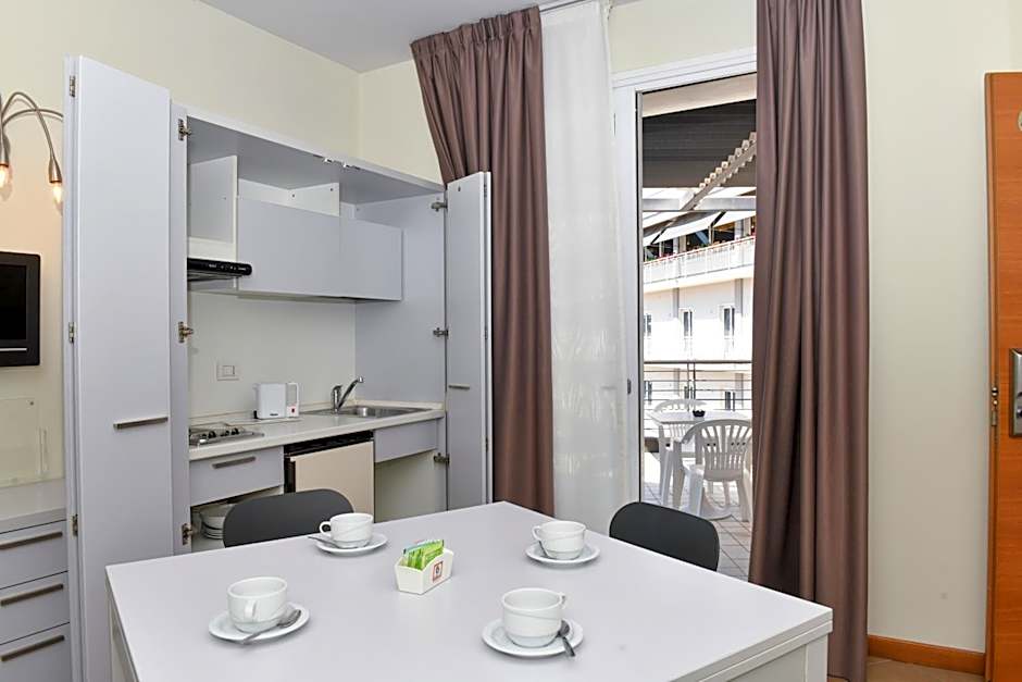This apartment features a large furnished terrace overlooking Piazza Mazzini and a balcony overlooking Via Bafile street. It includes a fully equipped kitchenette and living area with a double sofa bed. WiFi is free.