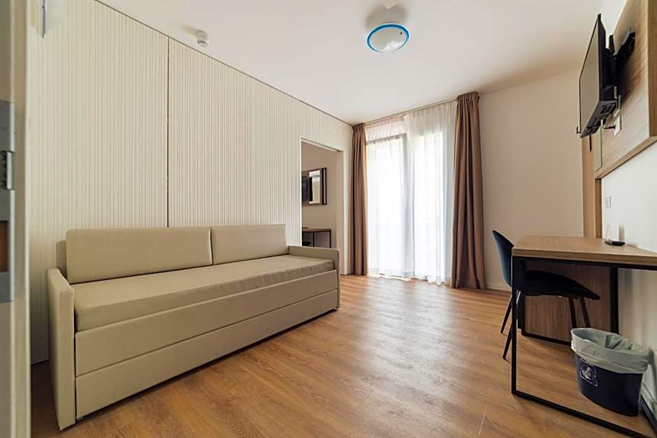 Beautiful renovated Executive Suite with private panoramic terrace with amazing sea view. The room has one double bed and 2 more sofa beds and it's partially divided by a wall.