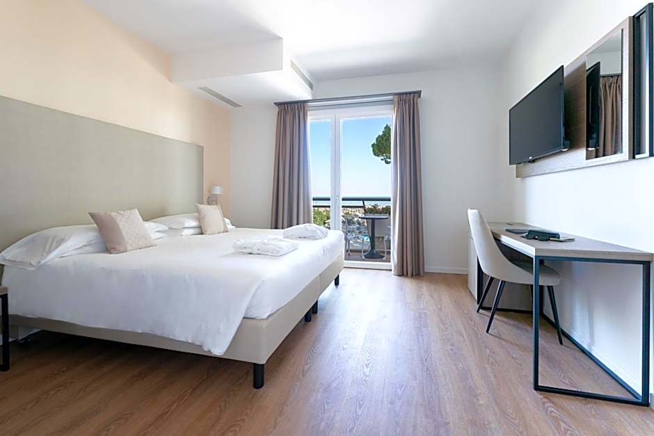 Double room with side balcony facing the sea overlooking the hotel's internal garden.