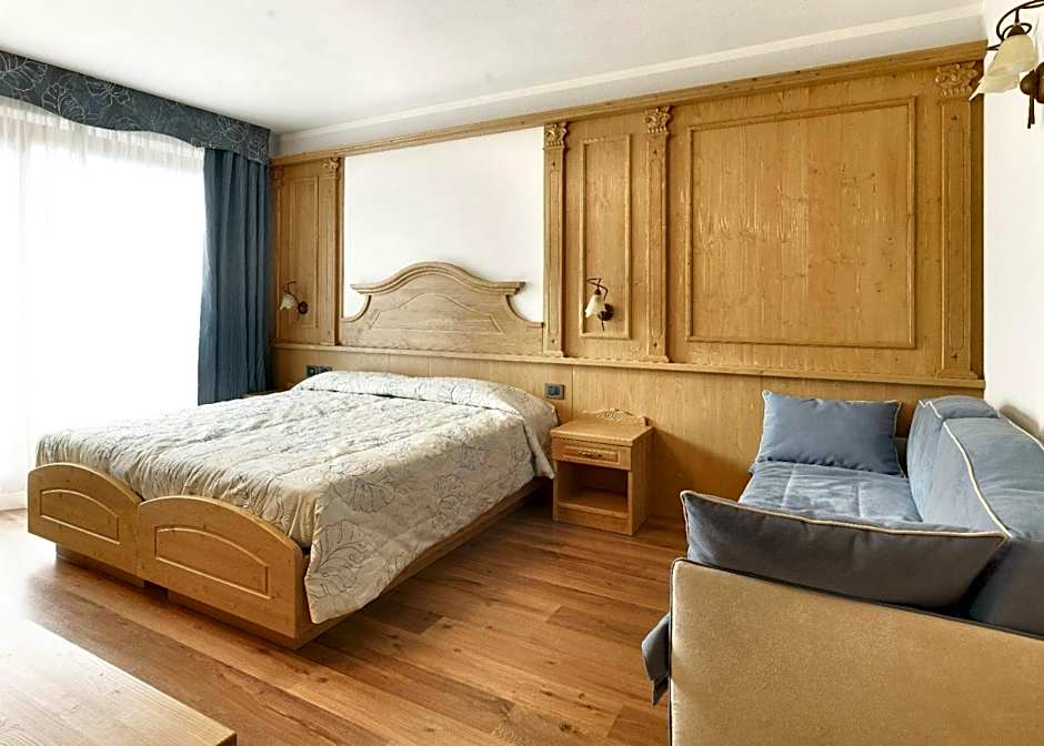 Large room with a traditional Alpine design and panoramic views of the Dolomites.