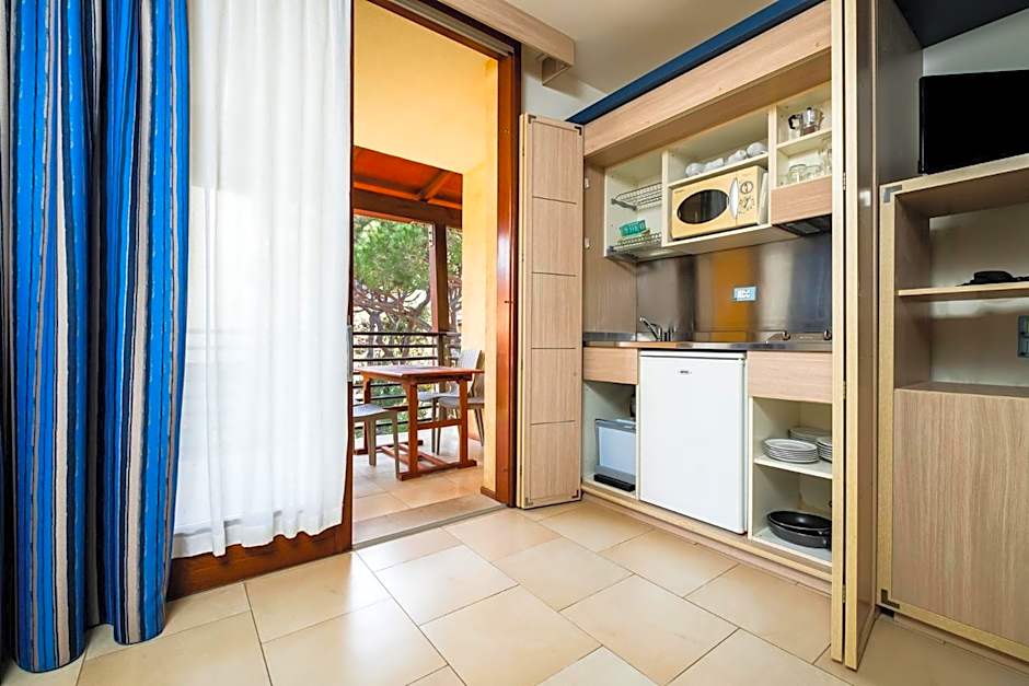 - very nice and friendly staff - big and clean room - big area without vehicle traffic (parking in front of the village and internal transport only by bus) - several restaurants; the pizzeria is the best one, real good pizza is served - beautiful beach with sand - water /seaside is very beautiful
