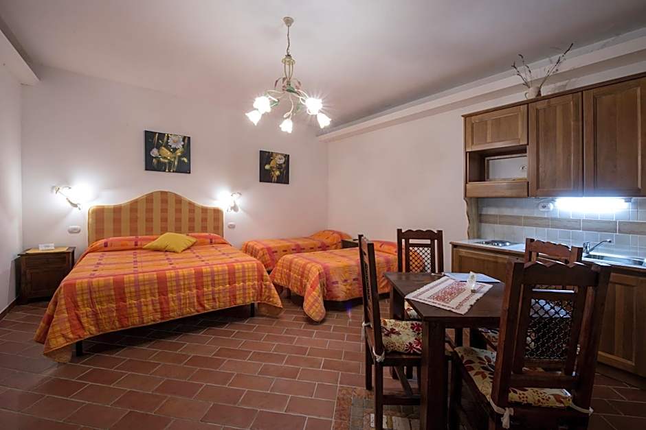 Refurbished studio with rustic Tuscan-style décor, terracotta floors, a kitchenette and direct access to a shared terrace ideal for outdoor dining. Features a large double bed, 2 twin beds and a flat-screen TV.