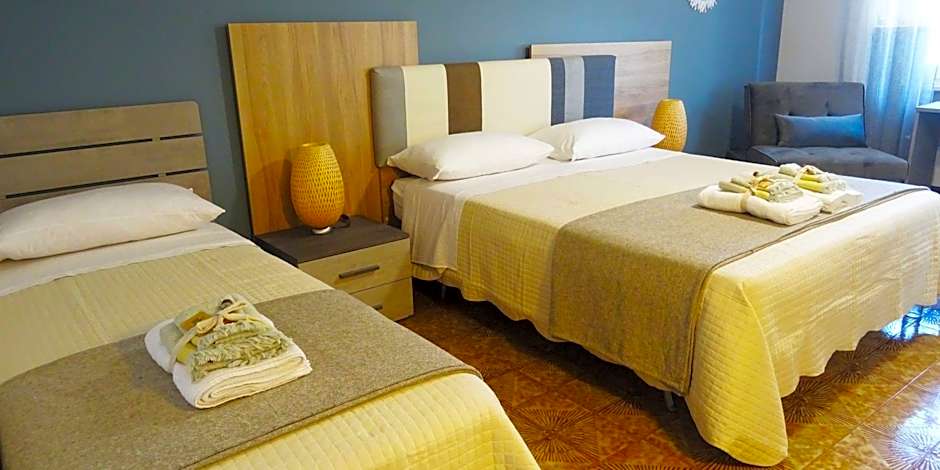 The quadruple room includes a private bathroom fitted with a shower, a bidet and a hairdryer. The air-conditioned quadruple room offers a flat-screen TV, a private entrance, a tea and coffee maker, a wardrobe as well as garden views. The unit has 3 beds.