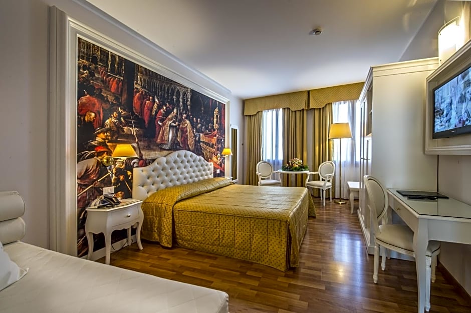 Spacious suite with a seating area and large windows. It features elegant Biedermeier furniture and Venetian-style tapestry. The bathroom includes a hot tub and luxurious toiletries. It can accommodate 2 extra beds.