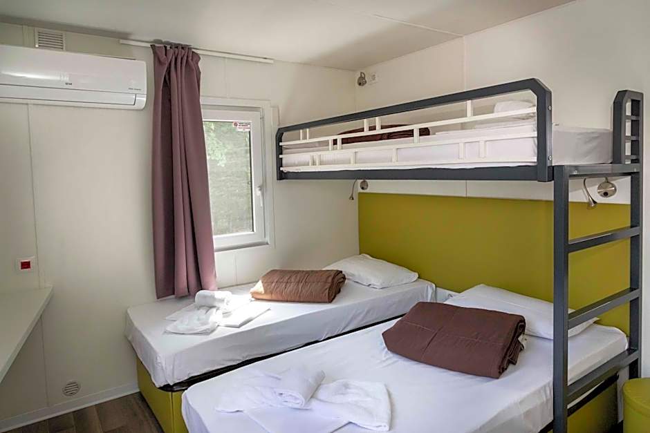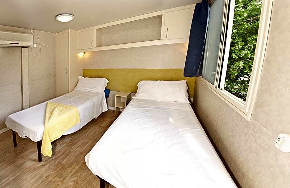 Air-conditioned mobile home with private bathroom. Features 1 bed and 1 set of bunk beds.
