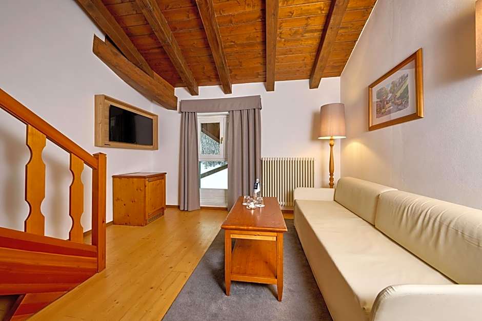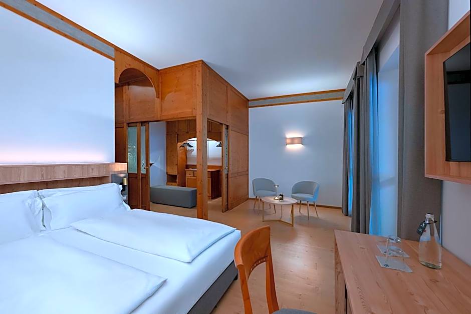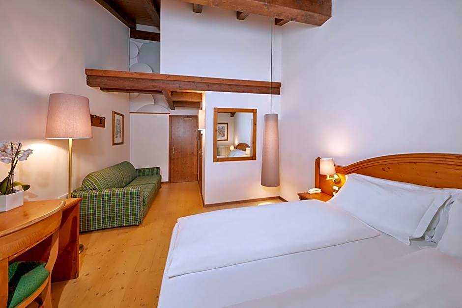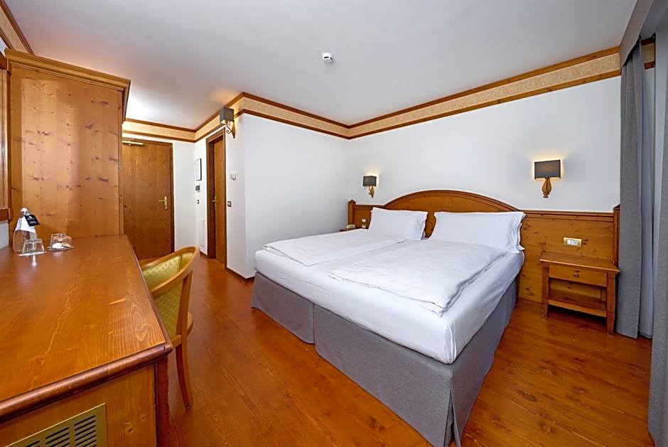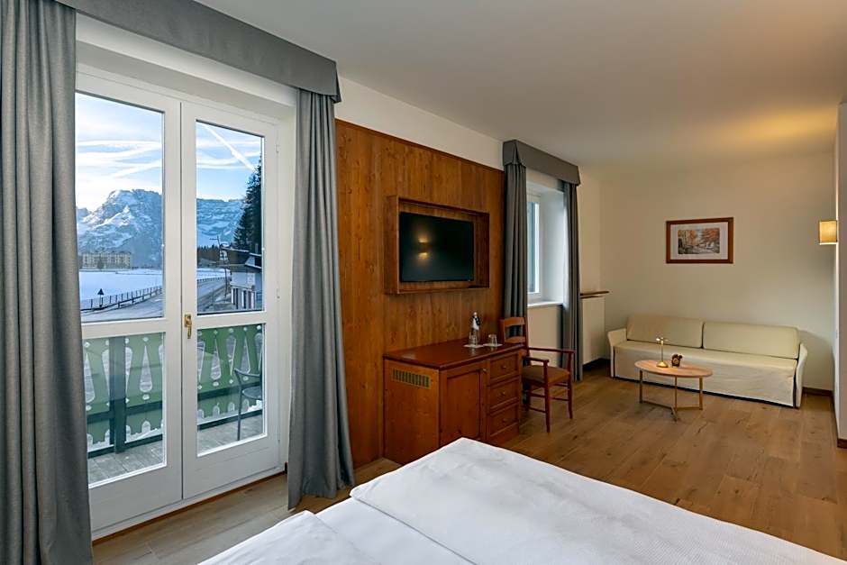 This mountain style room is fitted with parquet floors and wooden furnishings with view on Misurina Lake.