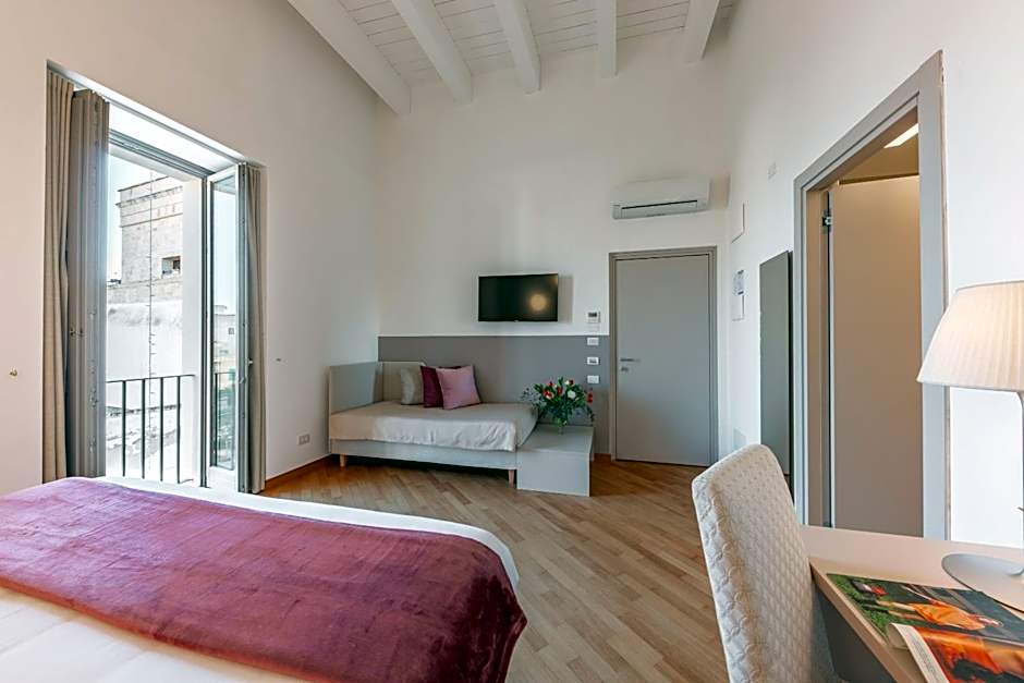 Rooms at Palazzo Indelli include Classic with 1 king bed, Mezzanine Quadruple Room with 6 twin beds and 1 king size bed, Superior Family Room with 1 king size bed, 2 sofa beds, and 2 twin beds, Deluxe Triple Room with Terrace featuring 1 king size bed, 2 sofa beds, and 2 twin beds. Smoking is not allowed in any room. Occupancy ranges from 2 adults and 1 child to 4 adults and 2 children.