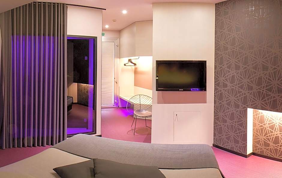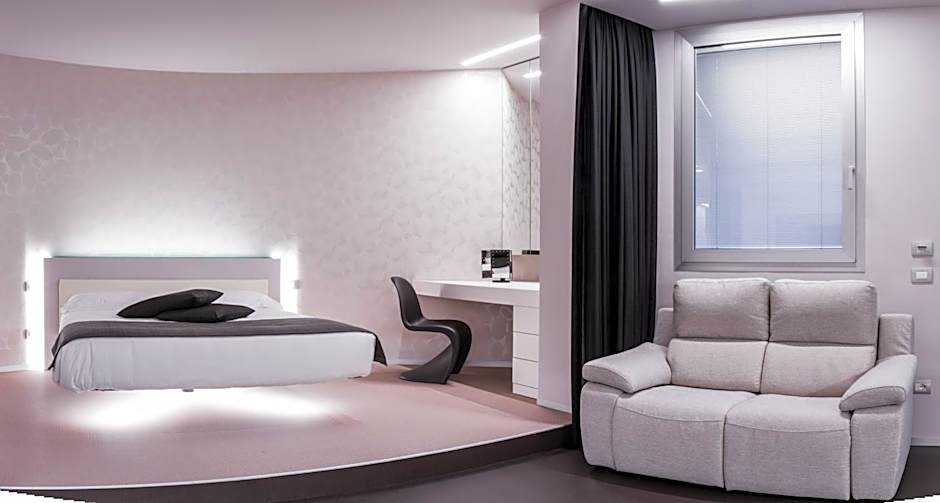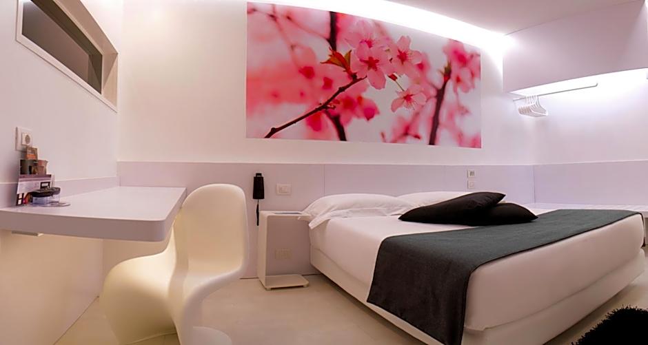 Stylish room with minimalist white décor, background music, and air conditioning. Includes satellite LCD TV, pay-per-view channels, and a mini-bar. The private bathroom has free toiletries plus a hairdryer.