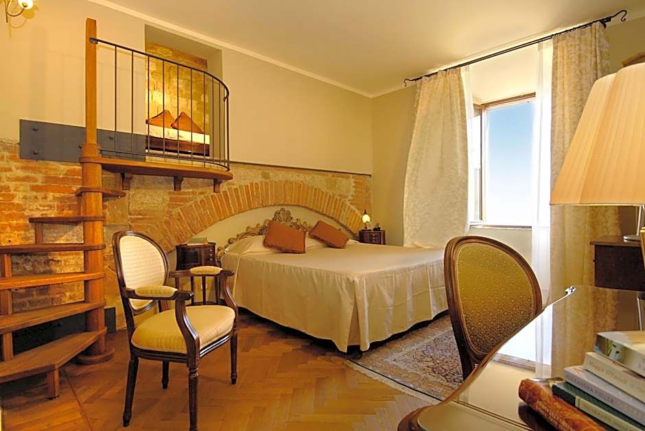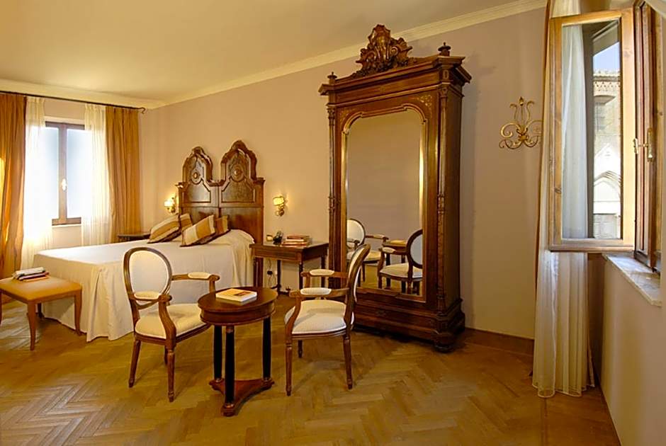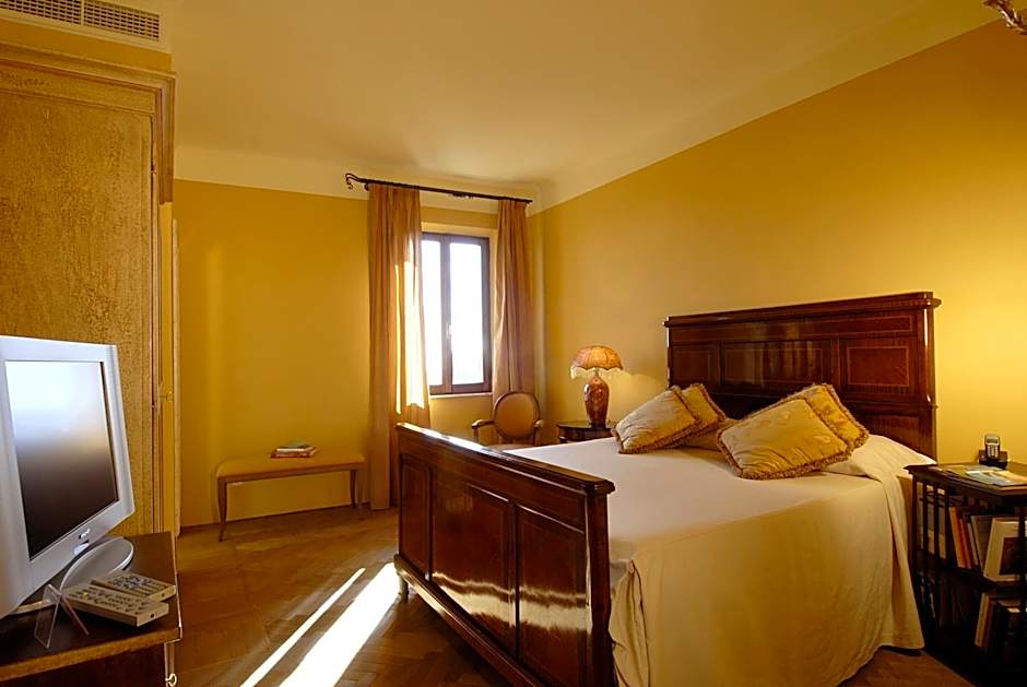 Large, elegant room with parquet floors, a small seating area and a selection of books in various languages. The large bed features a hypoallergenic mattress and pillows. The bathroom with rainfall shower offers views of Valdichiana and Val D'Orcia. WiFi is free.