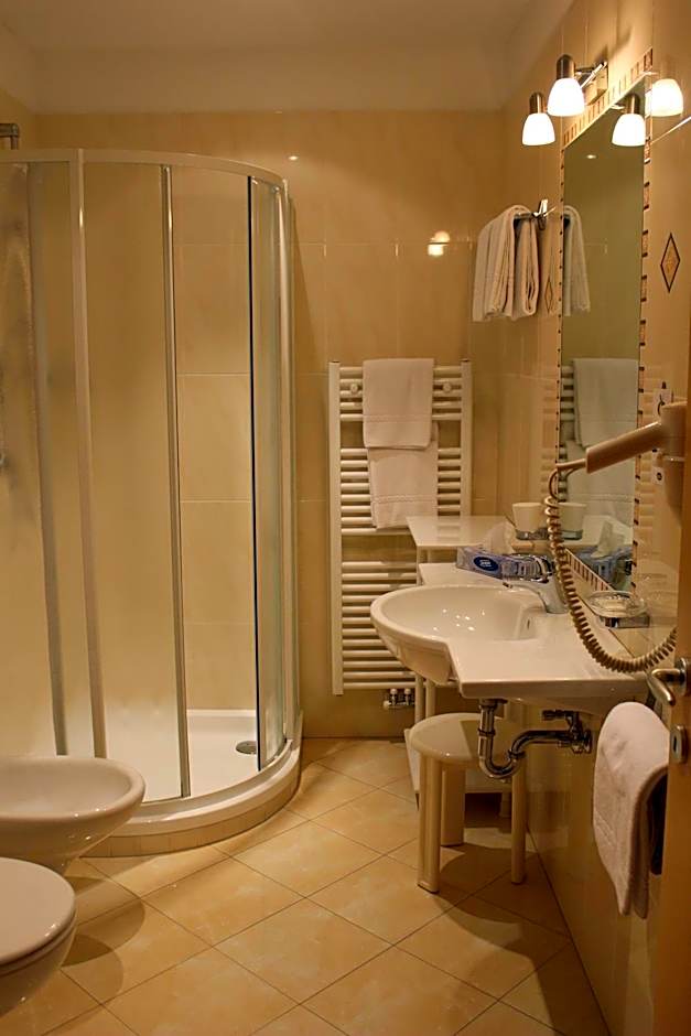 The standard room has Alpine décor with parquet floors and light-wood furniture. It features a private bathroom and an LCD TV with satellite channels. Some offer views of Ortisei.