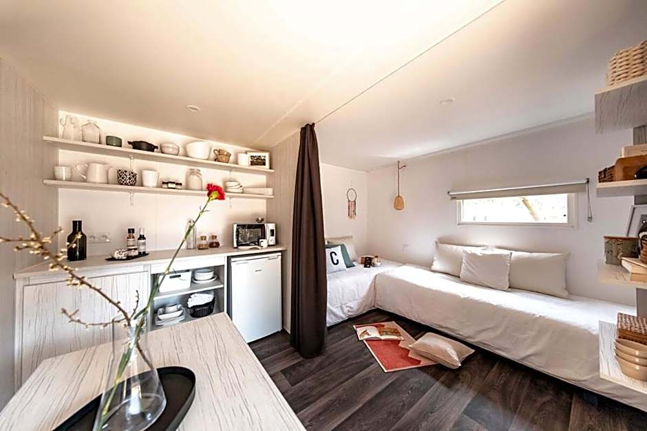 Masonry bungalow, 18m2, composed of 1 bedroom and a kitchenette. The bedroom has a TV, a bathroom with a shower, sink and toilet. The bungalow has air conditioning and an external veranda.