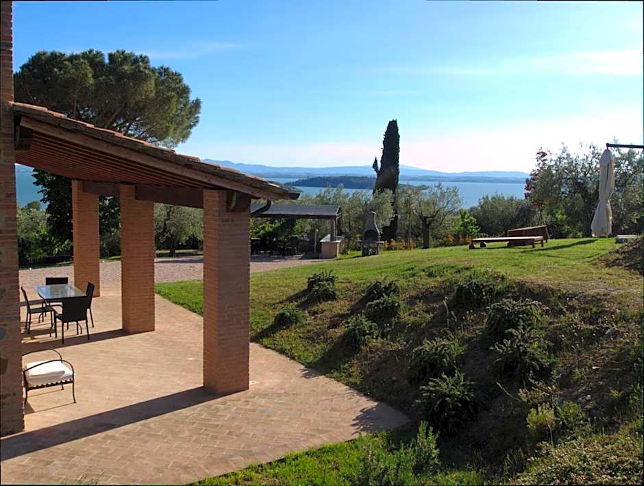 Antica Casale Tiravento is a nineteenth century (1866) farmhouse that has been fully modernized and converted into four apartments. It is located on a hill overlooking Lake Trasimeno at the end of a 400 metre un-metalled road; our hired Fiat 500 coped fine and there is ample parking at the villa. We were met by the owner, Annabella, who made us very welcome and settled us in to the apartment. She even insisted on carrying our bags. Our apartment was on the first floor with a large, private terrace with spectacular views of the Umbrian countryside and Lake Trasimeno. We had plenty of room for two although the apartment could cope with four if the bed-settee in the living room was used. An unexpected treat was daily delivery of a small loaf of bread and two filled croissants for breakfast. The villa is about a twenty minute walk into the centre of Passignano using the cycle track that goes around the lake. There is a Conad supermarket about seven minutes walk away. We spent nine days there and enjoyed the use of the olive grove with the covered seating areas and lovely lake views. Peaceful, comfortable and quiet with wonderful sunsets and a good wifi signal. Annabella and her son, Andrea, could not have been more helpful and I did not need to use my broken italian. We would recommend trips to Cortona and Panicale (location of the tv series Signora Volpe).