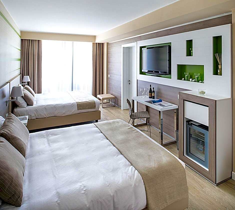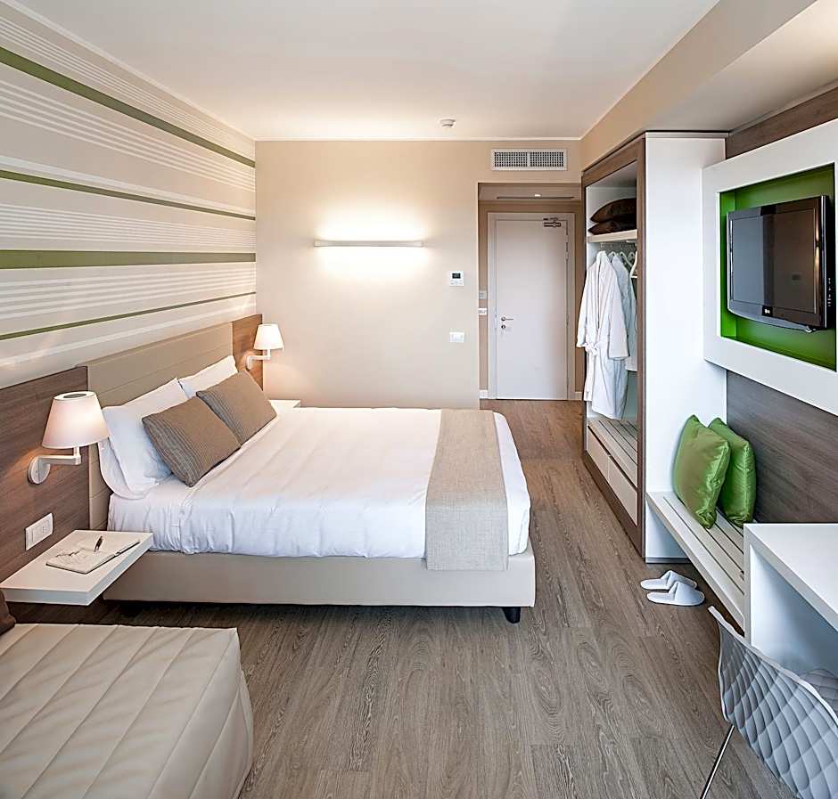 At the Enjoy Garda Hotel, there are various types of rooms available. The Double Room (1 Adult) is single occupancy and has a Queen size bed. The Superior Triple Room and Comfort Triple Room both accommodate 3 adults and have a Queen size bed and a Sofa bed. The Superior Double Room and Comfort Double Room both accommodate 2 adults and have a Queen size bed. Smoking is not allowed in any of these rooms.