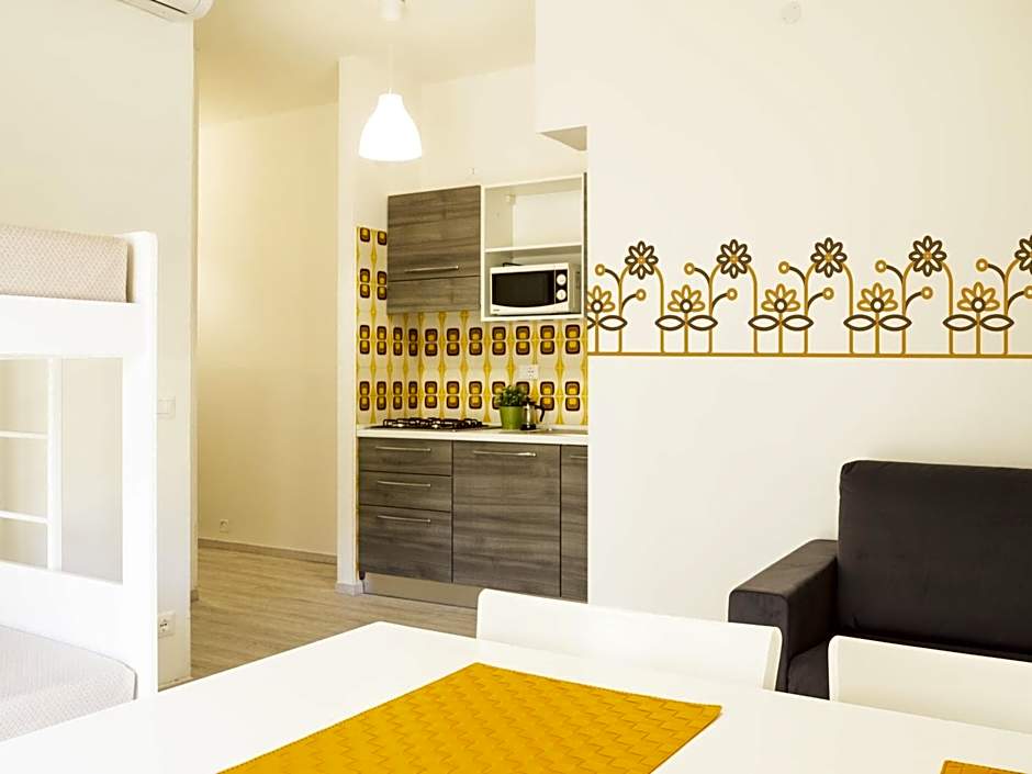 Charming superior two-room apartment on the first or second floor, accessible by stairs. Features a cozy bedroom with a double bed and bunk bed, a living area with a fully equipped kitchenette and double sofa bed, a modern bathroom with shower, and a balcony for relaxation.
