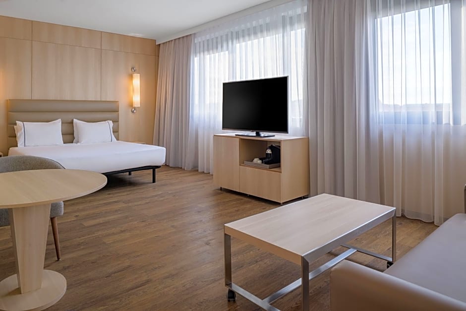 With a 50 inch led HD TV, this modern room with hardwood floors and free WIFI includes a fully equipped private bathroom with backlit mirror. Also offers a work desk, a fully equipped mini-bar and a telephone. Individual air-conditioning/heating available (depending on the season). The room has 1 king size bed and 1 single rollaway bed.