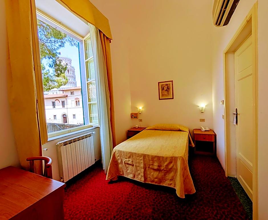 Hotel was lovely! We booked 2 single rooms, and they were very spacious and had double beds, which was a surprise. Room had everything I needed. Depending on which room you had, you have an amazing view of the top of the leaning tower. Staff were great and helpful when we had a mini issue and sorted it straight away! For the price you pay, it's such a bargain for a prime location and comfy room. Can be loud outside due to being in the tourist area, but gets quieter into the night. Couldn't recommend this place enough. Would 100% recommend to friends and stay again myself