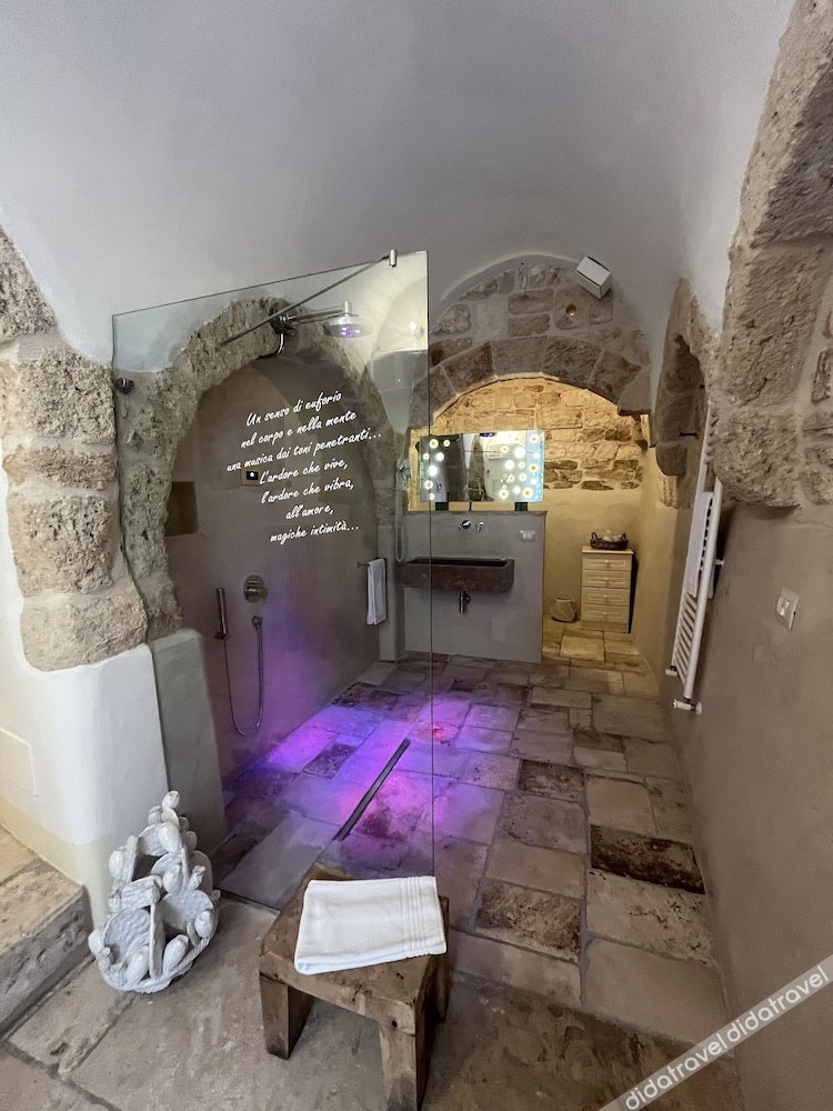 The room is located on the ground floor, built into a cave. It consists of two areas: a relaxation area with king size bed and a large shower area with walk-in chromotherapy shower. This room is located 492 feet from the main building.