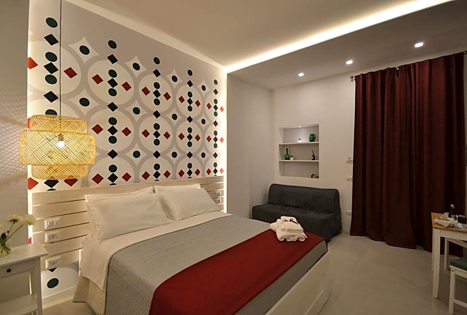 On the Pompeii doorstep, a flexible mix of rooms caters to different travelers. A Family Standard welcomes up to four adults, while a Standard, King offers a king-size bed for couples or friends sharing. Some double options pair a sofa bed with a queen-size bed, and Apartment 1 Room provides a cozy setup for two.