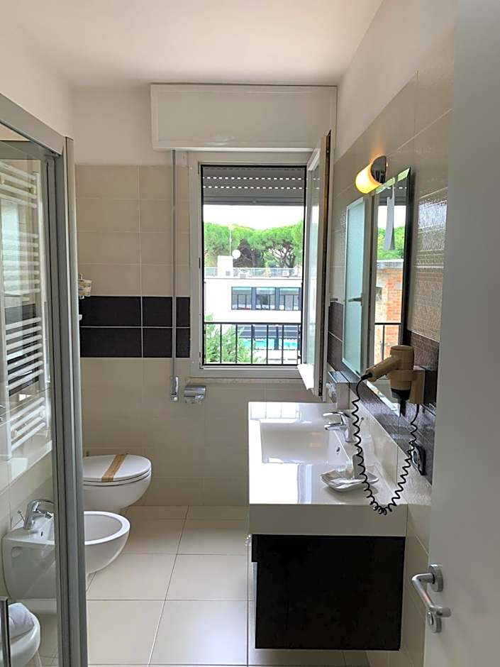 Nice hotel, room with a small balcony (the one shown on the site), decent size bathroom with all things necessary, good breakfast. Our dog was accepted everywhere, apart from the breakfast room but there was a workaround by letting us eat in the entrance hall near the bar. Very well located for walks to the beach or towards the commercial center. We used the free rent of bicycles, which was nice.