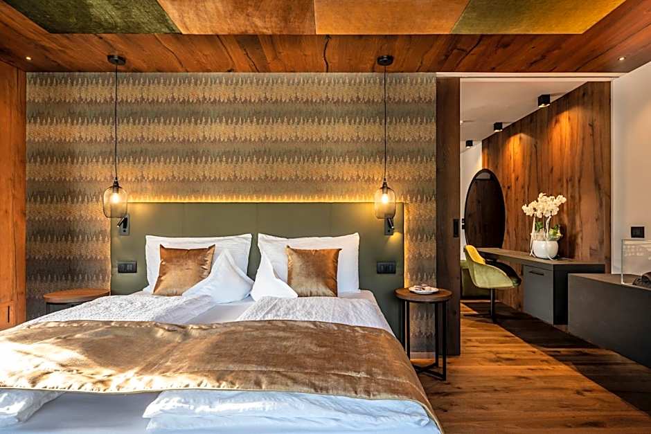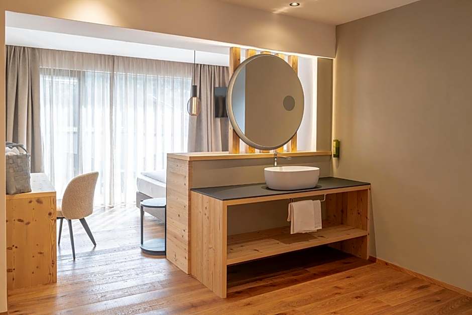 Wellness and style meet in the spa area with a steam bath and a sauna. A sun deck, terrace, and balcony greet guests with mountain or garden views. Soundproof rooms promise peaceful nights, providing a tranquil retreat after alpine adventures.