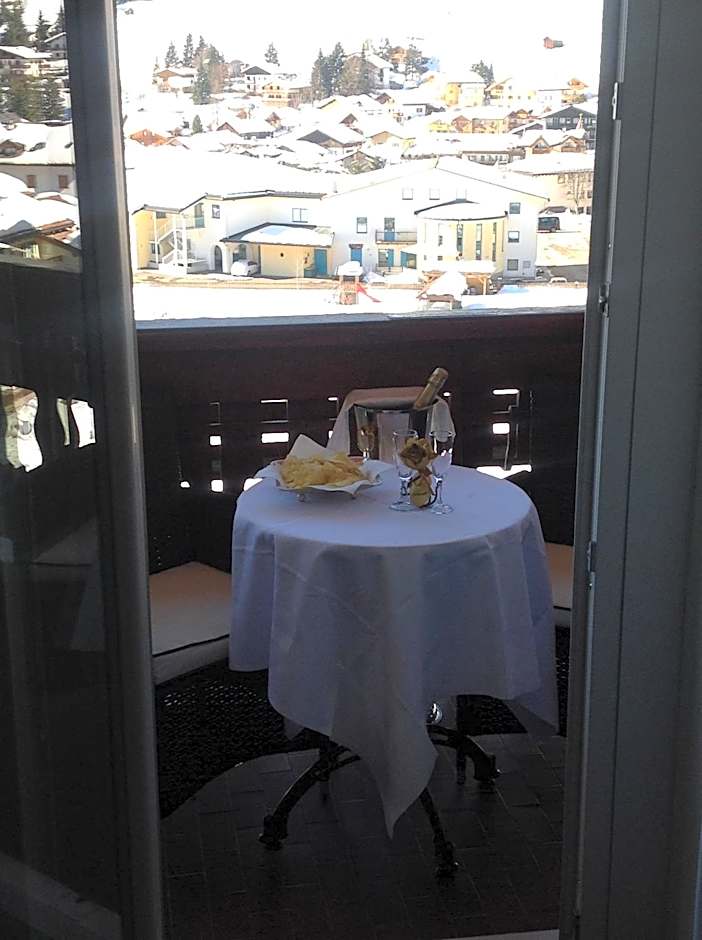 Room with attached bathroom with tiled or parquet floors. With window or balcony offering views of the Fassa Dolomites.