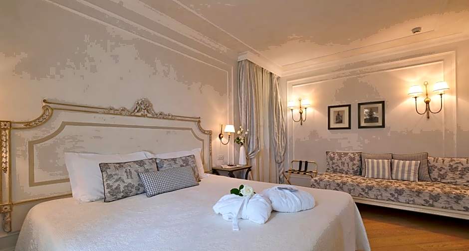 The Chervò Golf Hotel Spa, Resort & Apartment San Vigilio offers a variety of room types. These include suites such as the Prestige Duplex and Suite with Terrace, which have a room size of 484 sqft and 431 sqft respectively. There are also double rooms available, such as the Deluxe Double Room with Terrace and Comfort Double Room, with sizes ranging from 215 sqft to 280 sqft. The rooms can accommodate different numbers of adults and children, with some rooms offering twin beds along with queen or double beds. All rooms are non-smoking.