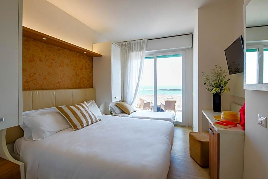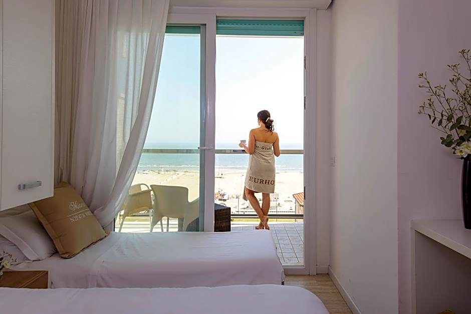 The Eurhotel offers a variety of room options including Double or Twin Rooms with either a frontal sea view or balcony, Standard Triple Rooms with sea view, Single Rooms with a balcony, and Triple Rooms with a balcony. All rooms are non-smoking and have different bed configurations to accommodate 1-3 adults. The sizes of the rooms range from 129 sqft to 205 sqft.
