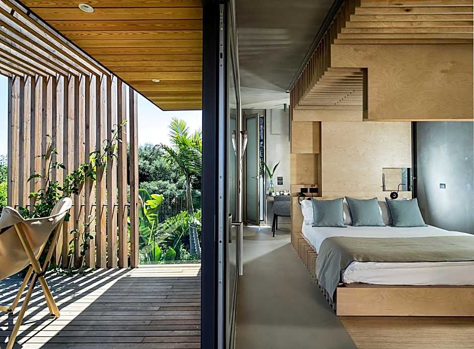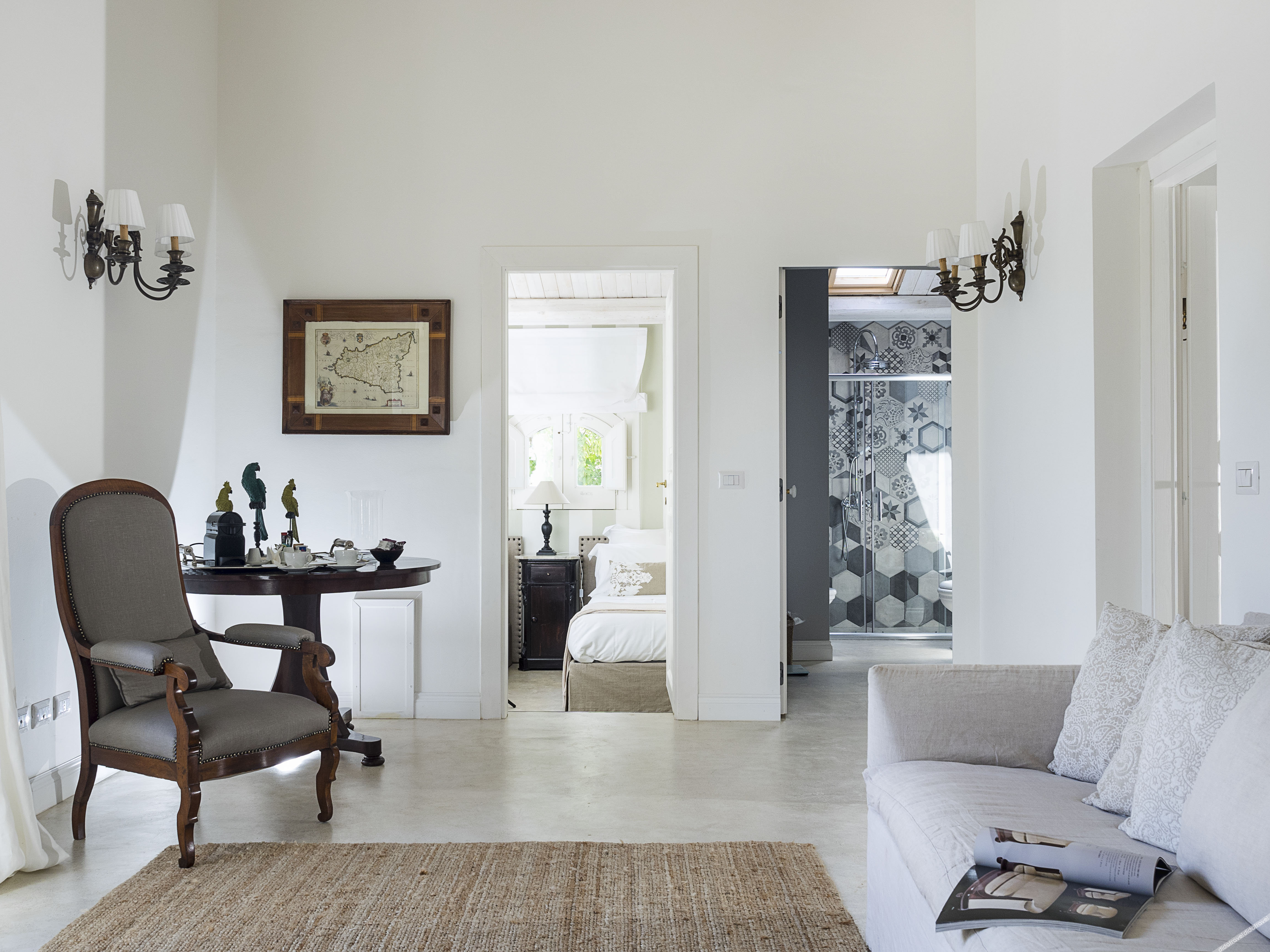 This suite is organized in two-floors with tile/marble floor, mini-bar and soundproofing. It has a living area on the first level with an extra single bed and bathroom. On the second level is located the double room and another bathroom.