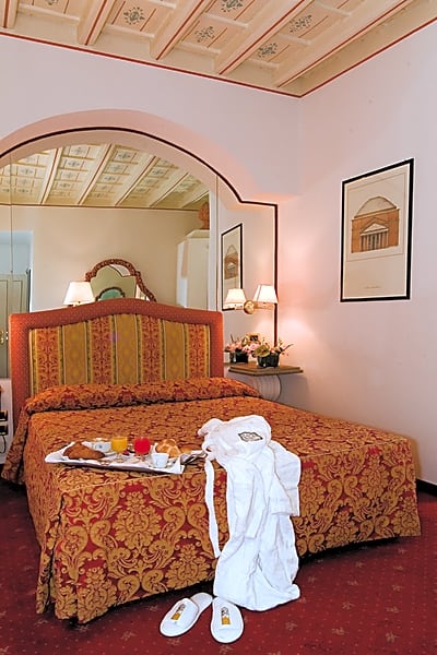 Prestige double or twin room Pantheon View (1 King Bed) is 205 square feet and includes a king-size bed 150-183 width plus desk, hairdryer, safe, bathrobes, and slippers.