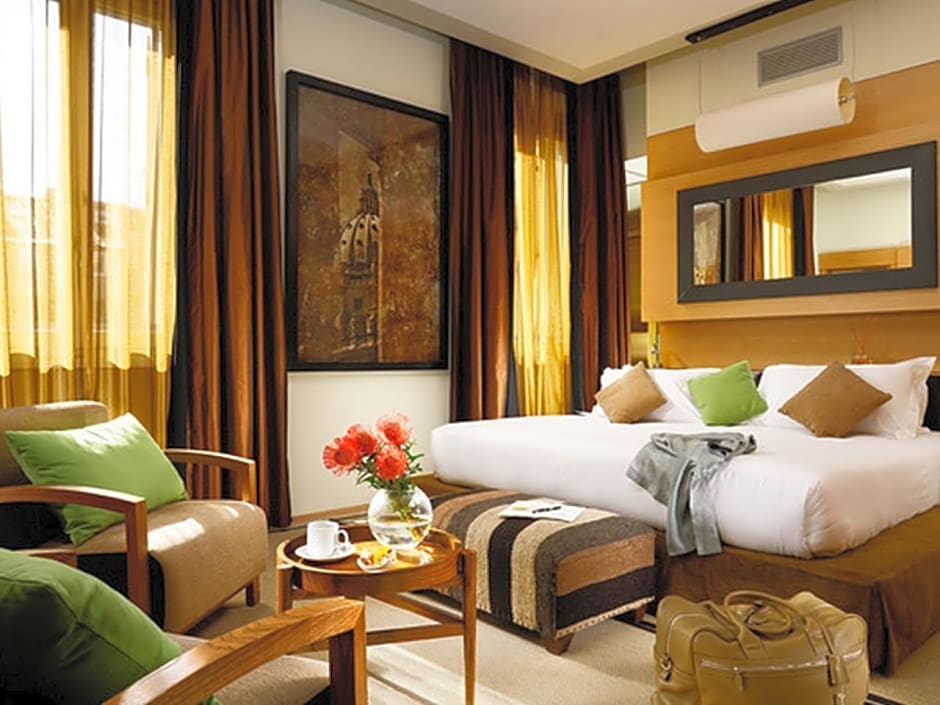 The hotel offers a range of room types including suites and doubles. Suite options include the Deluxe Suite with Private Terrace, Executive Suite, Classic Suite, and Deluxe Suite. The average room size ranges from 280 sqft to 646 sqft. Smoking is not allowed in any of the rooms and bed sizes vary from queen size to king size with some rooms also offering a sofa bed. The maximum occupancy ranges from 2 adults in the Standard Double Room to 4 adults and 1 child in some of the suite options.