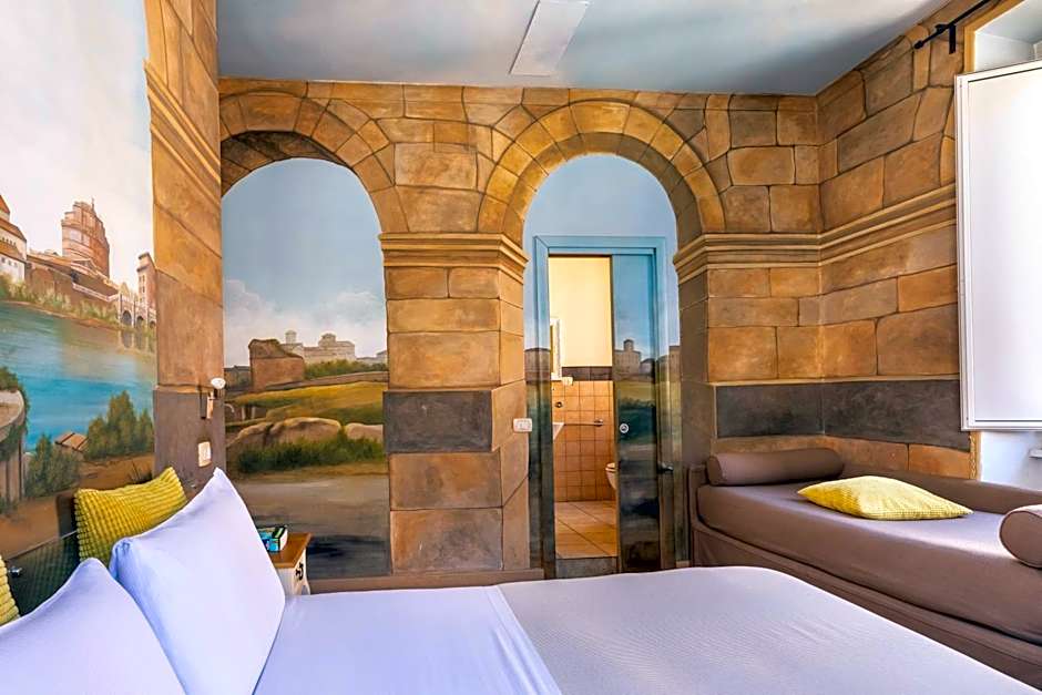 Walls or ceilings hand painted with trompe-l'oeil images of Rome. Special feature: free use of mobile phone with an Italian Sim card inside. Room includes digital TV and free Wi-Fi.