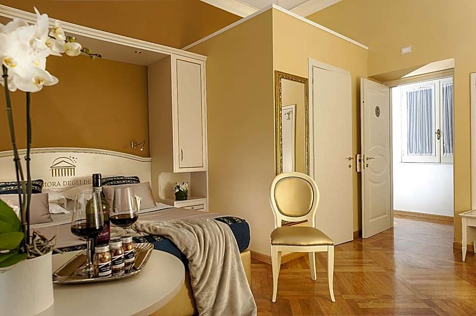 At Dimora Degli Dei, guests can choose from rooms like Standard, Superior, Deluxe Double/Twin Rooms, and a Junior Suite. All rooms do not allow smoking. Occupancy ranges from 2 adults and 1 child to 3 adults and 1 child. Bed sizes vary from Queen, Twin to Double beds, with room sizes from 215 to 269 sqft.