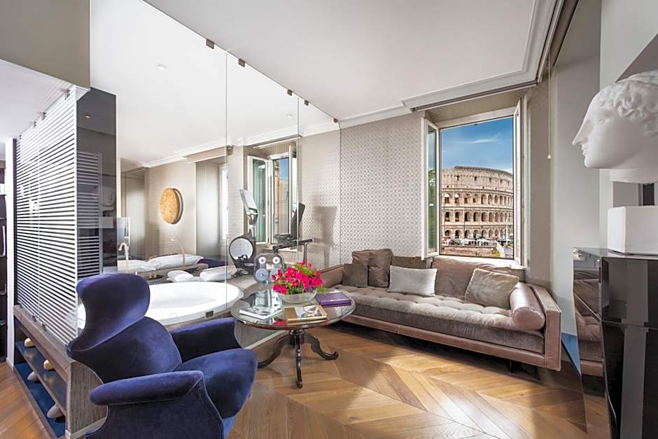 Overlooking the Colosseum, this elegant suite features a mini gym and wellness area with a hot tub, Turkish bath and chromotherapy lighting. Decorated in velvet and leather, the suite has a separate lounge and bedroom, with parquet and Japanese tatami floors.