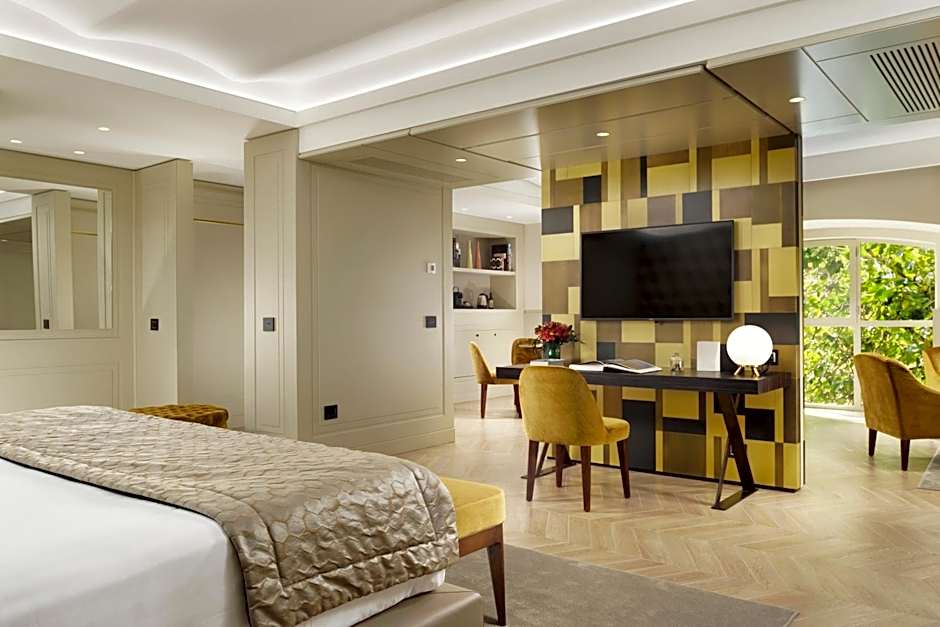 Spacious suite with a separate lounge and dining area. The bathroom includes a marble bath and a large shower, while the work area has free Wi-Fi.