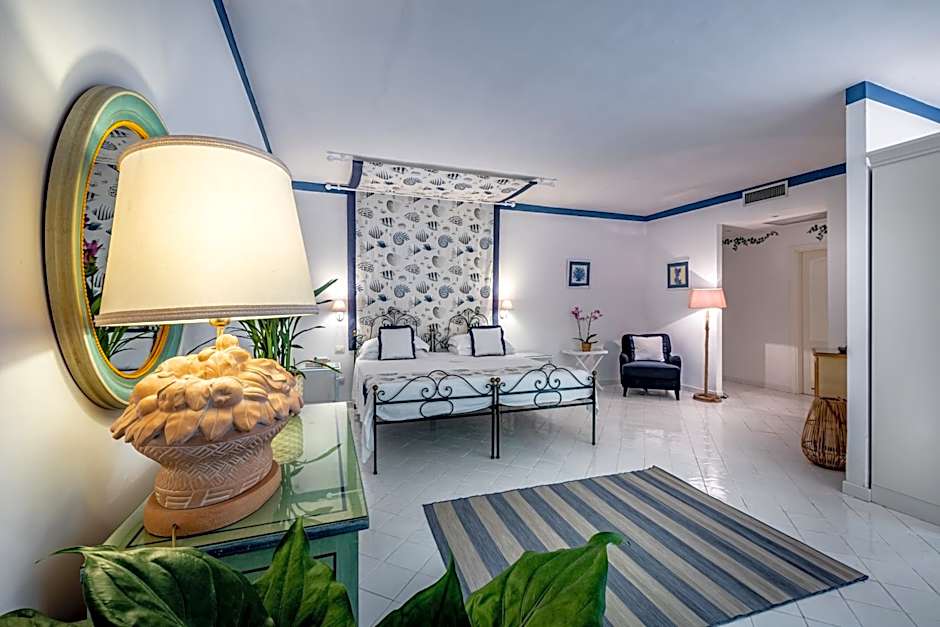 This twin/double room has the most wonderful sea view from the sunny terrace equipped with seating area and umbrella. The marble bathroom has a bath with shower overhead. The room has the best sunset view overlooking Capri and the Amalfi Coast.