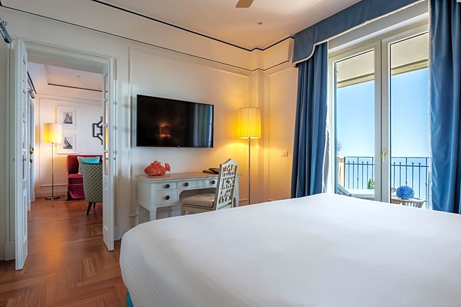 The Grand Hotel San Pietro Relais & Chateaux offers a wide variety of rooms including Side Sea View, Premium, Junior Suite, and Suites like Isola Bella Penthouse Suite and San Pietro Executive Suite. Most rooms accommodate 2 adults and 1 child, while suites like Premium Family Terrace Room can accommodate 4 adults. Bed sizes range from Queen to Twin beds in different configurations. Smoking is not allowed in any of the rooms.