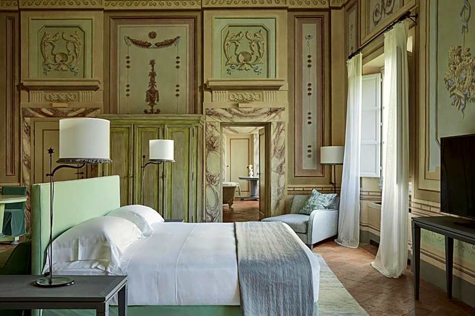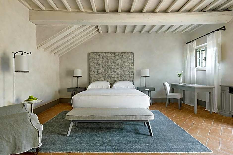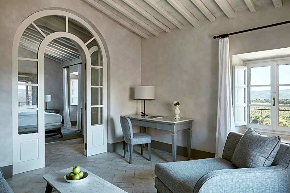 This larger room has views of the Chianti hills, a warm color scheme and terracotta floors. It also includes an LCD TV, cashmere bed linen and free Wi-Fi. Its bathroom has marble surfaces, a make-up mirror and designer toiletries.