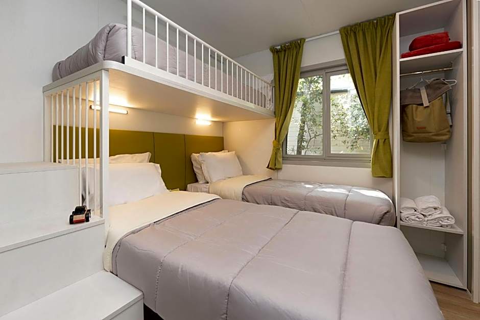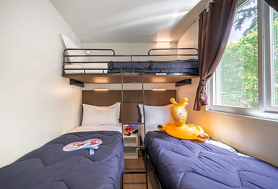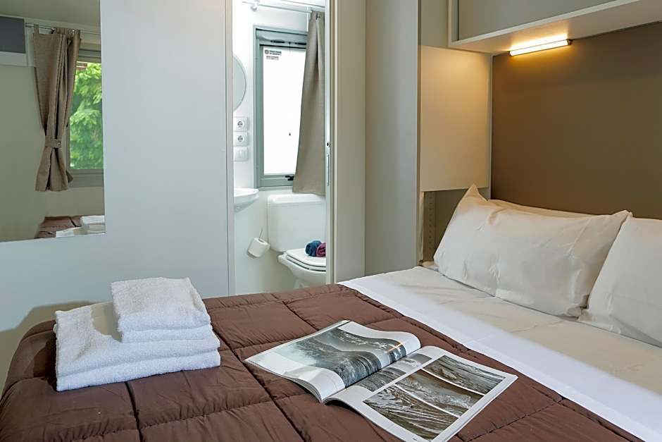 Air-conditioned mobile home consisting of 1 double bedroom, 2 twin bedrooms, a fully equipped kitchenette, 2 bathrooms and an equipped private terrace.
