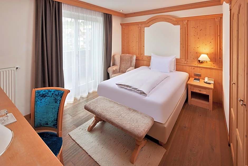 Suite Fugger Noblesse with private Finnish sauna. Scent of Swiss pine and natural wood floor. Precious Loden fabrics, hypo-allergenic beds and down feather pillows. Large night and day area (separable). Porch. Finnish sauna and wellness bag with soft bath robe and slippers. Luxury bathroom with double sink, rainshower, mirror, hair dryer. WC and separate bidet. 2 satellite TVs, wardrobe, Nespresso machine, Wi-Fi, telephone, mini bar, safe.