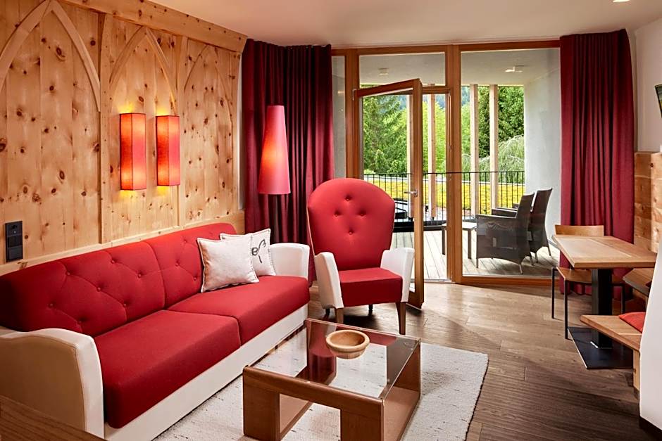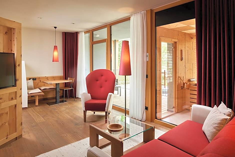 Suite Fugger Royal with private infrared sauna. Scent of Swiss pine and natural wood floor. Wellness from the very beginning. Precious Loden fabrics, hypo-allergenic beds and down feather pillows. Large night and day area (visually separable). Porch with view of the park. Infrared sauna and wellness bag with soft bath robe and slippers. Luxury bathroom with double sink, rainshower, mirror, hair dryer. WC and separate bidet. 2 satellite TVs, wardrobe, Nespresso machine, Wi-Fi, telephone, mini bar, safe.