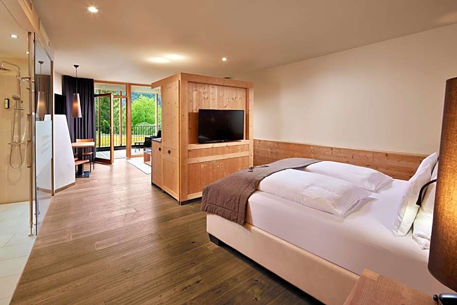 High quality aged red pine wood and natural wood floors. Wellness from the very beginning. Precious Loden fabrics, hypo-allergenic beds and down feather pillows. Double room with large night and day area (sliding door). Porch with view of the park. Wellness bag with soft bath robe and slippers. Luxury bathroom with double sink, rainshower, mirror, hair dryer. WC and separate bidet. 2 satellite TVs, wardrobe, Nespresso machine, Wi-Fi, telephone, mini bar, safe.
