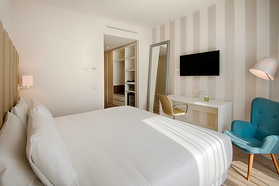 JUNIOR SUITE NEW STYLE VIEW AND TERRACE 1 PAX is 420 square feet and includes a double bed 131-150 width plus terrace, extra beds on demand, desk, satellite tv , cable tv, hairdryer, tea and coffee making facilities , and safe.
