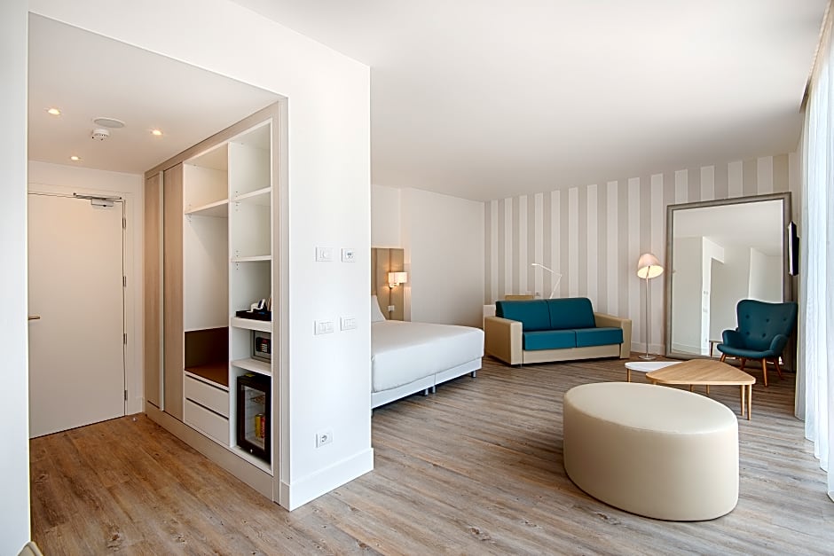 JUNIOR SUITE NEW STYLE VIEW AND TERRACE 2AD+1CH is 312 square feet and includes a double bed 131-150 width plus desk, satellite tv , cable tv, hairdryer, tea and coffee making facilities , and safe.