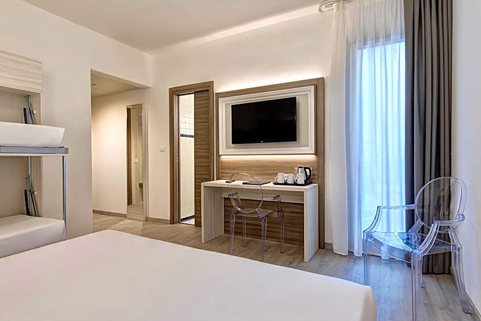 The Best Western Hotel San Giusto offers a variety of room types including Family, Double, and Triple rooms. Smoking is not allowed in any of the rooms. The rooms range in size from 194 sqft to 215 sqft. The occupancy of the rooms varies from 2 adults and 1 child to 4 adults and 2 children. The bed sizes in the rooms include Bunk beds, Queen size beds, and Twin beds.