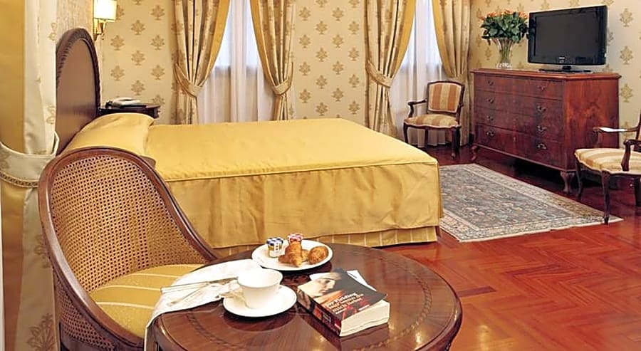 This elegant Venetian-style room features wood floors, oriental rugs and handmade Murano glass lamps. It is air conditioned and has either a hydromassage bath or shower. You have a view of the internal garden, the Rio Malpaga canal or the city's rooftops.