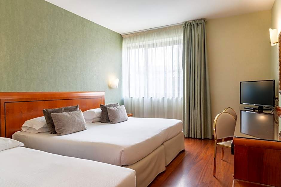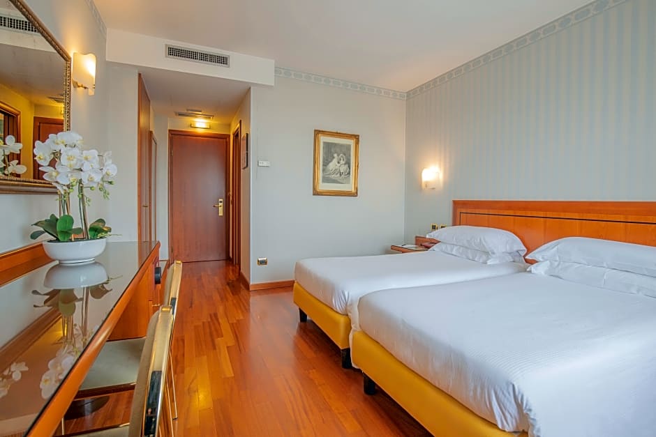 This twin/double room is modern, essential, comfortable..66 ft². Perfect for a young couples or those who want to save money. Parquet floor, bathroom with shower, air conditioning, safe, mini-bar, LCD TV, Wi-Fi and soundproofing. The room can be occupied by up to 2 people